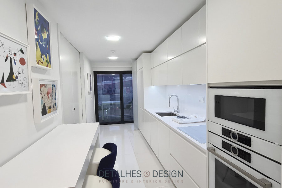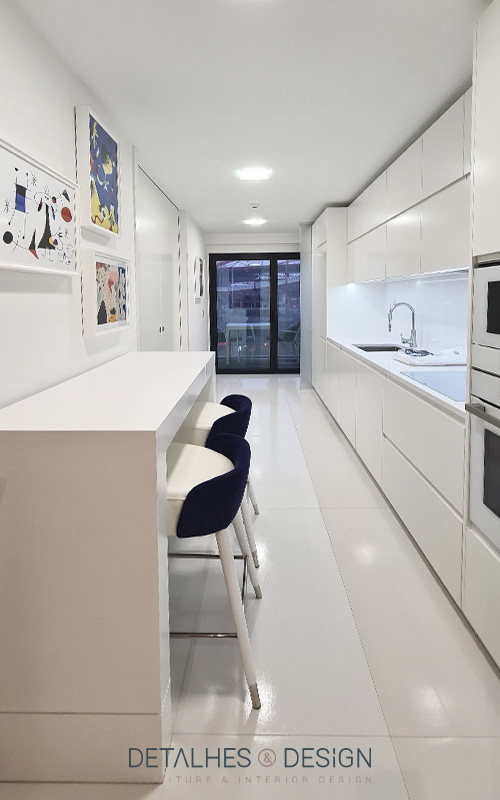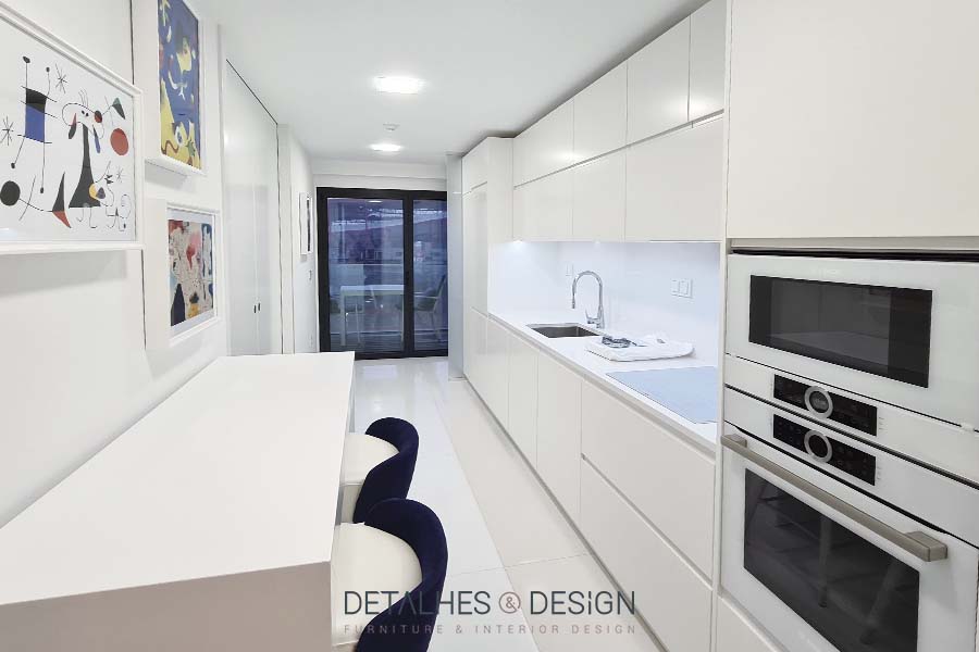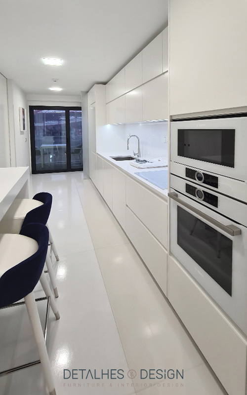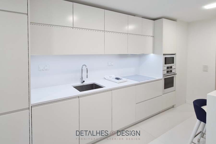 Esta cozinha assume um design clean e limpo onde se destaca a cor branco, proporcionando um ambiente luminoso.