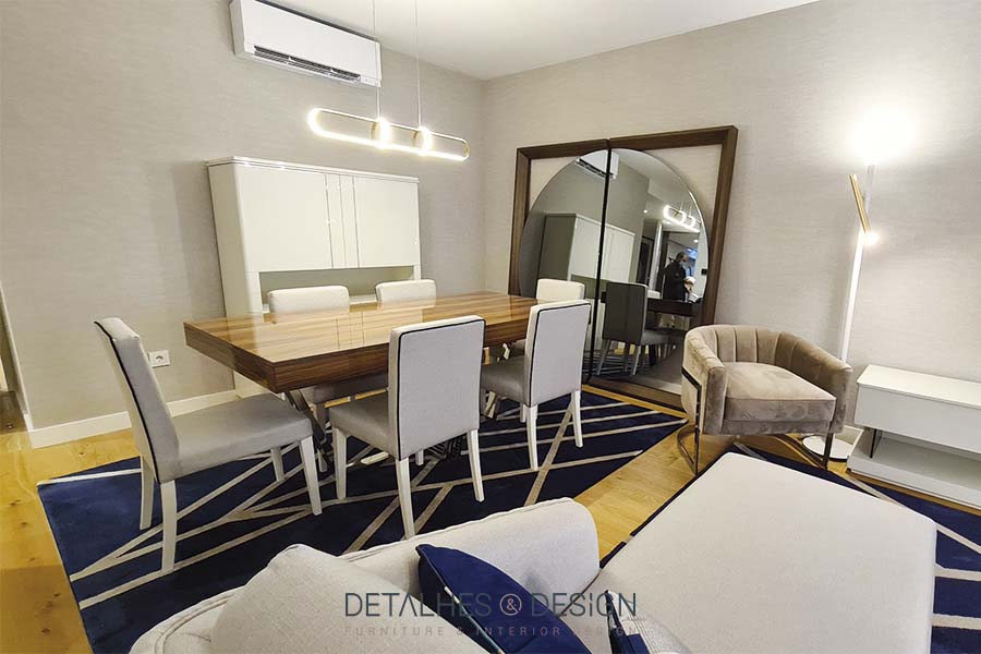 A combinação da madeira com o estofo de tom neutro permite destacar as peças de mobiliário. Destaca-se o espelho ELLENDER 1950 pela sua elevada dimensão, robustez e sofisticação.