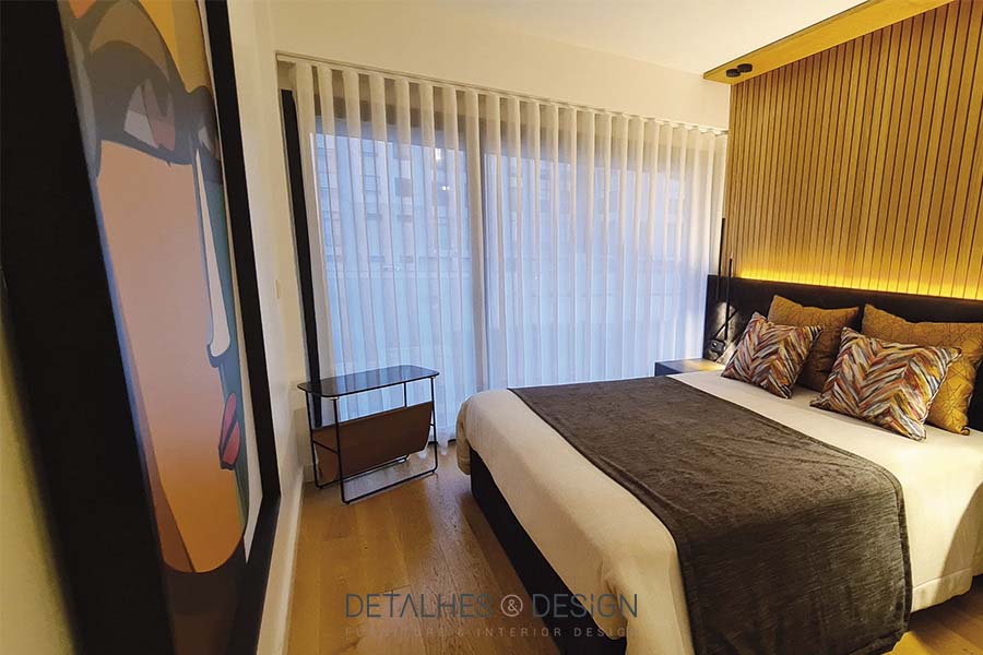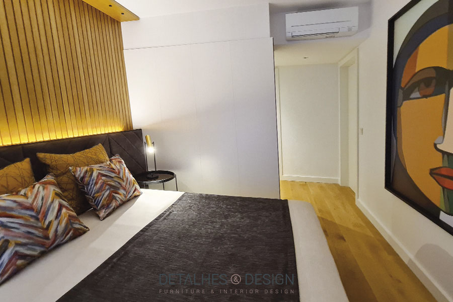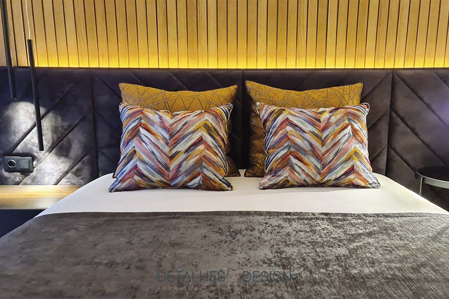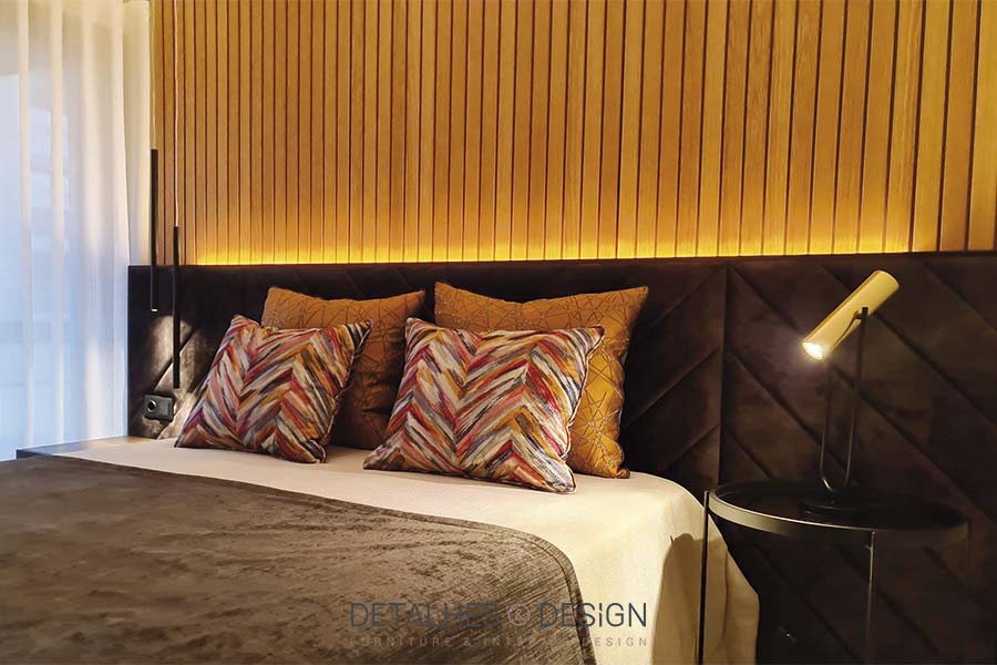 Nesta suite, a paleta de cores baseia-se em dois tons – preto e amarelo. A contrastar com a cama de estofo escuro, colocou-se um ripado em madeira como forma de continuação da cabeceira até ao teto. O pormenor da iluminação faz a diferença.
